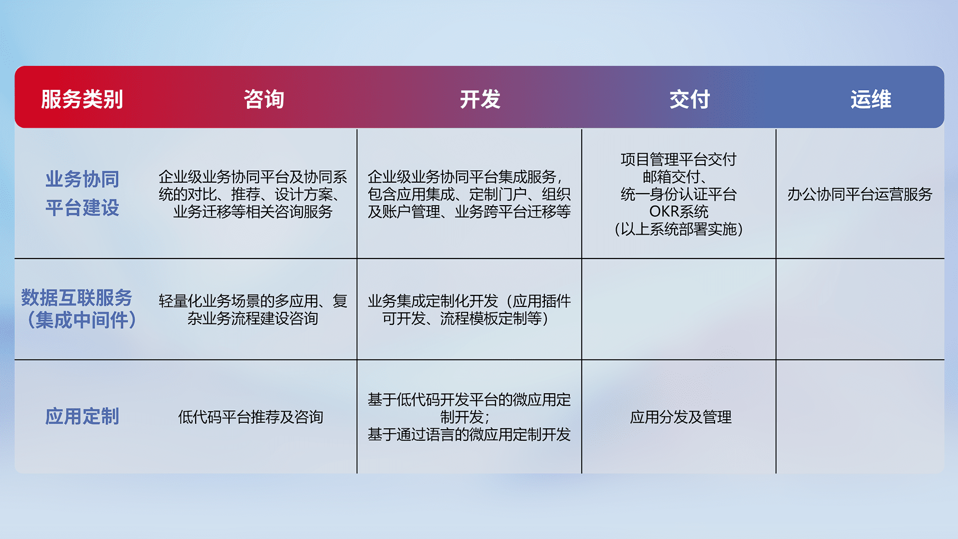 针对钉钉、、、企微、、、、IDaas等平台级产品提供产品的规划、、、、方案、、、、交付、、定制化开发等服务,,,实现如统一协同办公、、、智能客户服务、、、、混合会议管理、、、智能数据查询、、、等业务场景,,实现数字化转型。。。