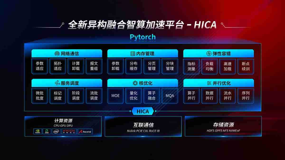 通过自研的服务层、、、中间适配层、、以及调度编排算法,,采用数据并行、、模型并行等多种并行方式,,把并行计算任务进行有效的分解,,,使其分别由相应的软件栈和算力资源来承接。。。。当GPU资源变化,,,,HICA可以实时动态调度计算子任务并调整模型拓扑和架构,,,以充分聚合各种算力资源。。。