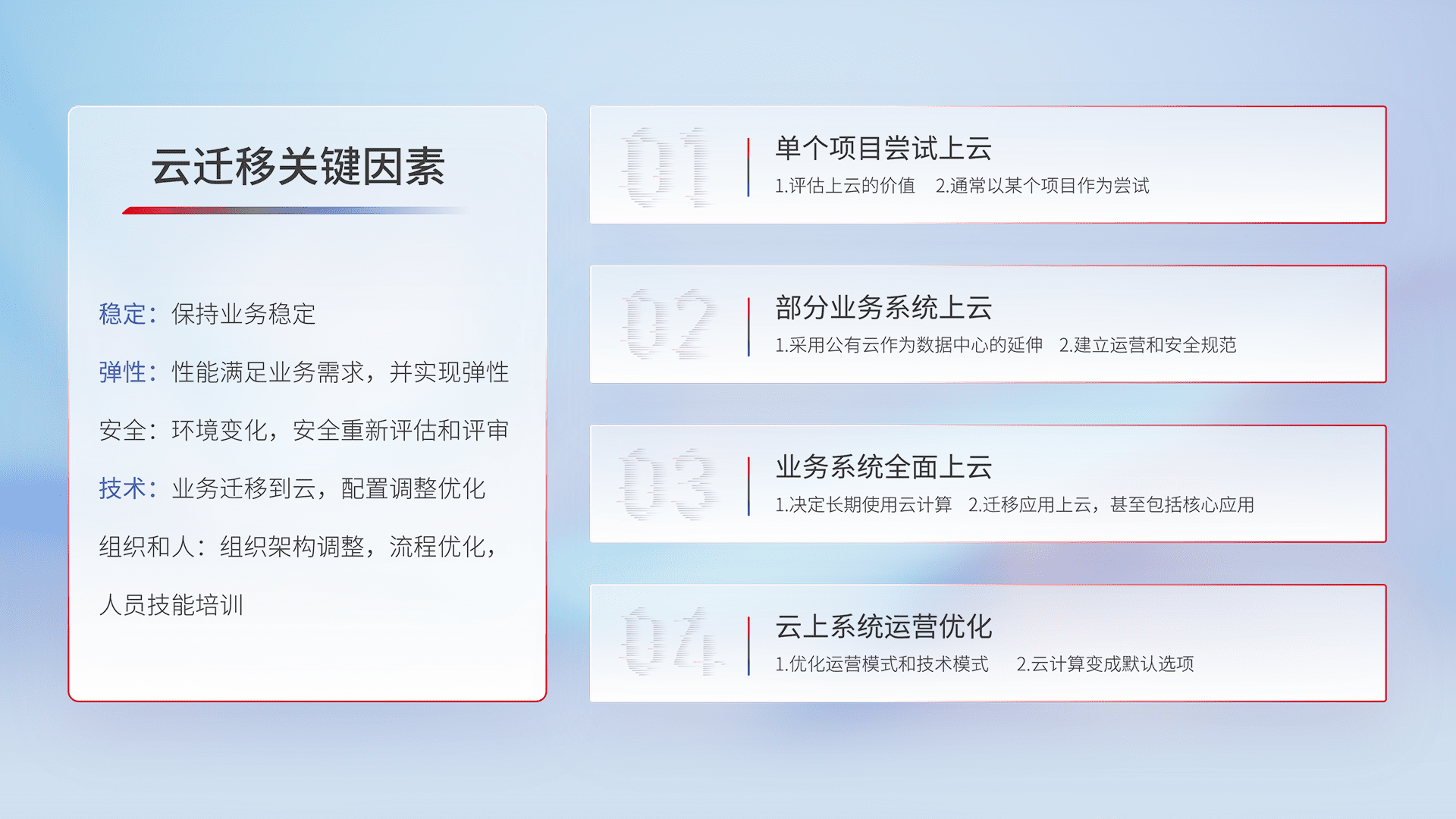 结合实际业务,,,从规划设计、、、、云平台选型、、、云原生改造、、、数据迁移、、、、集成交付,,迁移全过程为客户识别最佳上云路径,,,做好风险识别管理,,,设计网络架构、、身份权限、、、安全审计合规、、操作审计、、、、日志审计、、监控告警策略、、、多站点容灾设计等,,,对云上基础设施进行整体规划,,,提升IT治理水平,,,以满足弹性、、、高可用、、、、高性能的需求。。。。